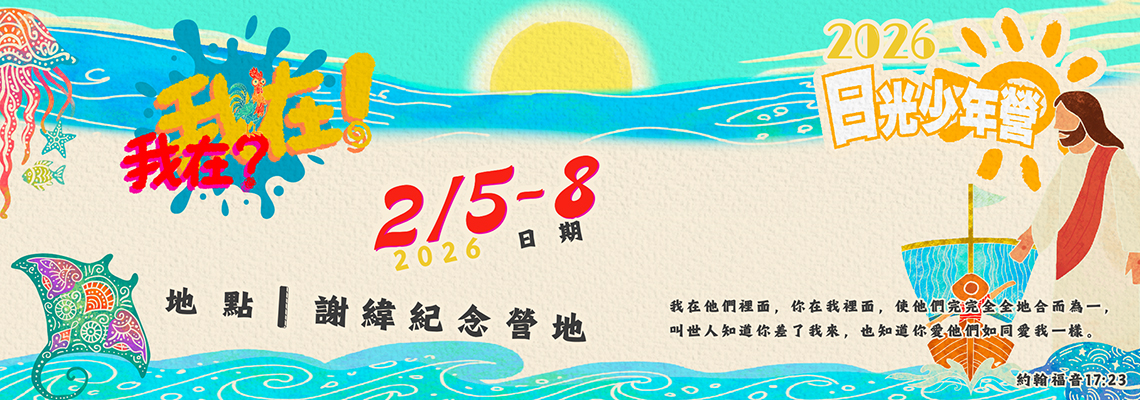 2026年日光少年營 《我在?我在!》 邀請全台灣教會青少年參與,以體驗教育的方式,結合信仰反思的型態,鼓勵青少年與主連結,與耶穌成為至好朋友;為青少年建立信仰的根基、為教會培育門徒訓練的基礎。2026年2月5日~2月8日 ‧ 謝緯紀念營地 等你來挑戰!