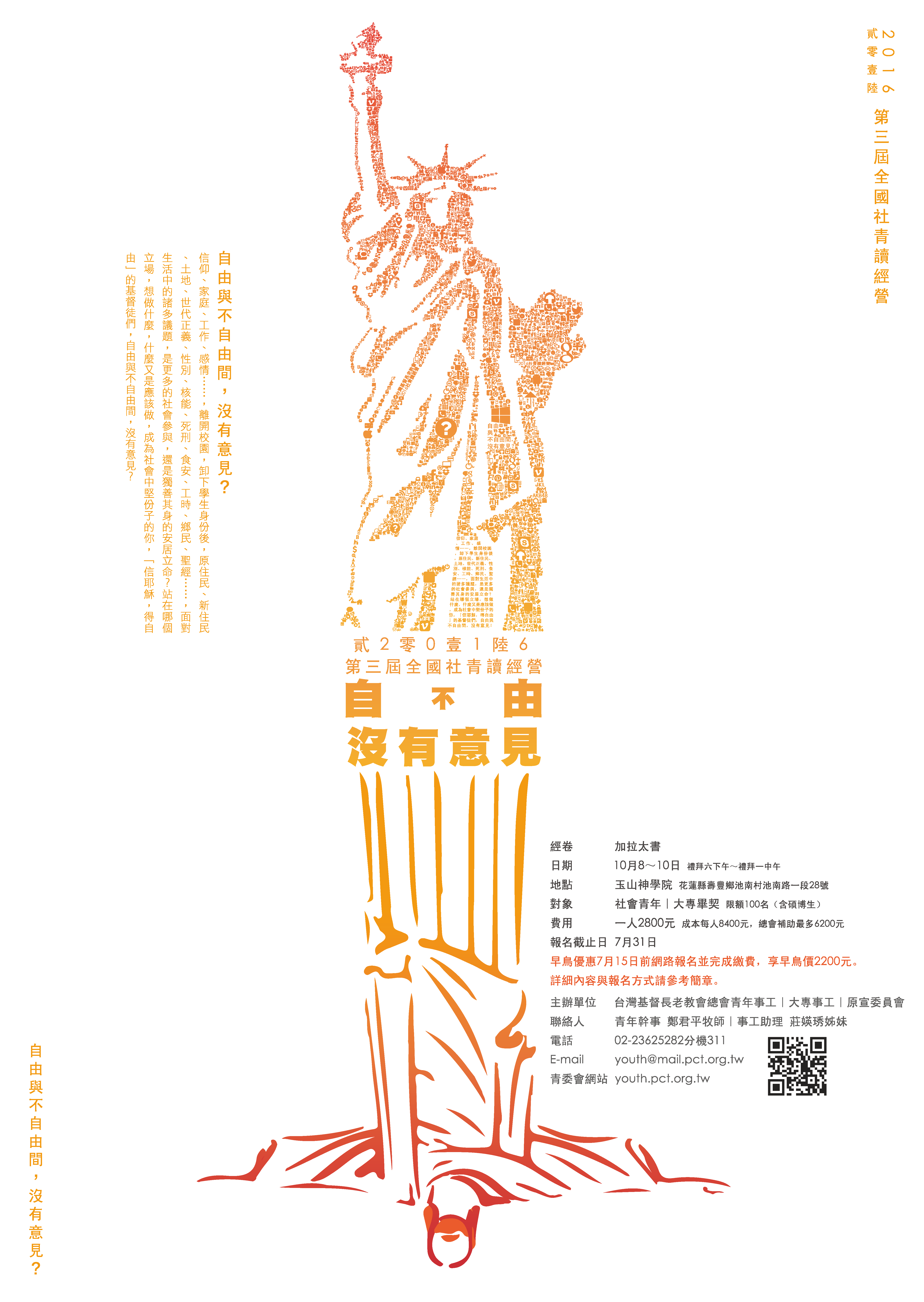 主題:自由與不自由間,沒有意見? 經卷:加拉太書 日期:2016年10月8~10日 地點:玉山神學院 籌委小組14人: 郭上恩先生(台北中會明志教會)、 吳添輝先生(新竹中會公館教會)、 Langpaw Tupeleng 羅勝方先生(排灣中會佳義教會)、 唐榮恩執事(東部中會碧雲莊教會/花蓮大專畢契)、 鄒來瑋小姐(新竹中會南崁教會/台北大專畢契)、 鄭智銘先生(屏東中會彌迦教會/台北大專畢契)、 游以青小姐(泰雅爾中會豐山教會/台中大專畢契)、 姚亘貞小姐(屏東中會屏東教會/高雄大專畢契)、 吳佳宜小姐(高雄巨蛋牧鄰行道會/花蓮大專畢契)、 戴慧真小姐(東部中會知本教會/台東大專畢契)、 鄭君平牧師(總會青年幹事)、 莊媖琇小姐(總會青年助理/高雄中會三一教會/台北大專畢契)、 朱思恩小姐(總會大專助理/台北中會明志教會/台中大專畢契)、 Supina Nakaisulan牧師(總會原宣幹事)。 |