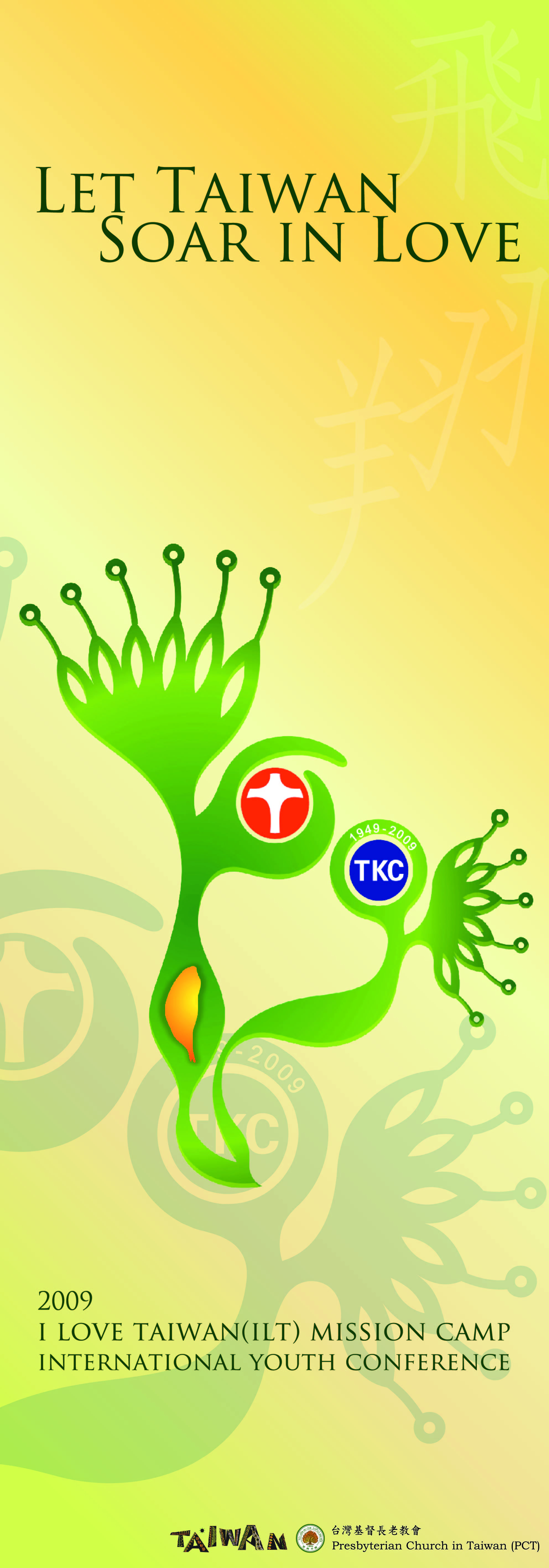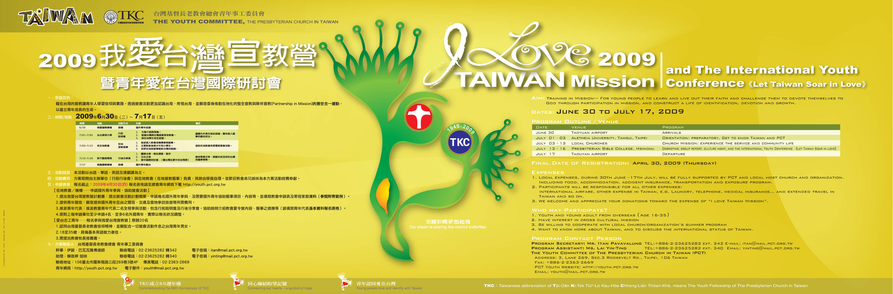 主題:讓台灣在愛中自由飛翔 Let Taiwan Soar in Love 行前訓練會 :2009年6月30日~7月3日,真理大學 地方教會服事:2009年7月3~13日,全台地方教會 行後分享會 :2009年7月13~17日,聖經學院 地方教會共21間,機構1間: 七星中會安樂教會、大安教會、台北中會文山教會、客家宣教中會山崎教會、台中中會磐頂教會、民族路教會、嘉義中會大林教會、民雄教會、朴子教會、祥和教會、台南中會口埤教會、高雄中會太爺教會、屏東中會迦南教會、排灣中會文樂教會、春日教會、東美中會長光教會、布農中會紅葉教會、卓溪教會、泰雅爾中會烏來教會、魯凱中會霧台教會、茂林教會、謝緯紀念青年營地。