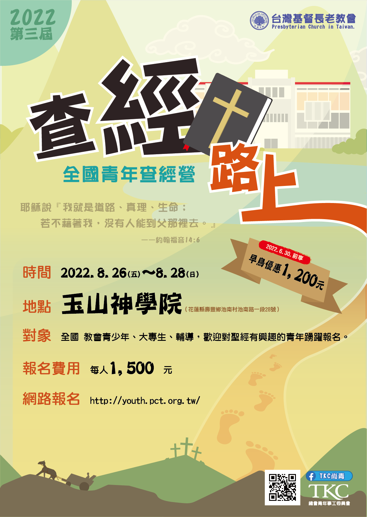 2022年青年查經營[查經路上─道路、真理、生命] 走在「查經路上」,你是否迷惑過?可曾讀不明白?渴望看見亮光?讓我們到花蓮玉山神學院解惑,從聖經中遇見真理,在鯉魚潭畔得到活水。邀請您8/26-28一起到玉山神學院來走這段「查經路上─道路、真理、生命」