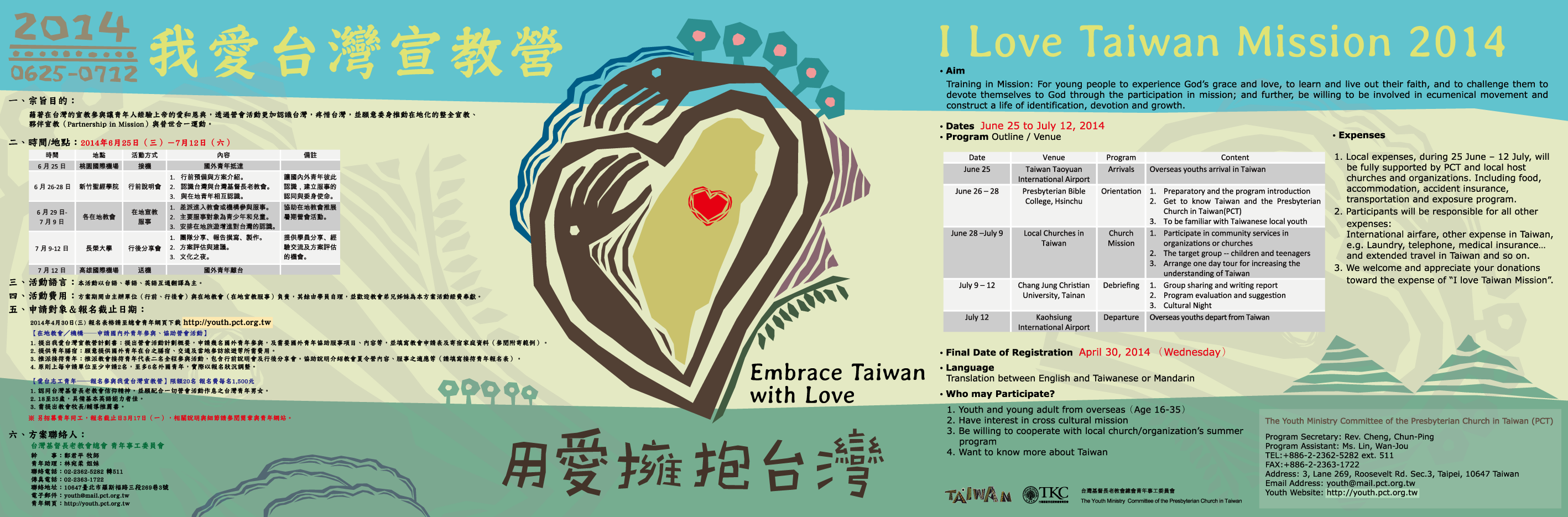 主題:用愛擁抱台灣 Embrace Taiwan with Love 行前訓練會 :2014年6月25~28日,聖經學院 地方教會服事:2014年6月28日~7月9日,全台地方教會 行後分享會 :2014年7月9~12日,長榮大學 地方教會共19間: 七星中會建德教會、礁溪教會、台北中會樹林教會、新竹中會墩仔腳教會、客家宣教中會山崎教會、台中中會民族路教會、牛眠教會、彰化中會員東路教會、路上教會、竹塘教會、嘉義中會祥和教會、台南中會口埤教會、大灣教會、屏東中會車城教會、排灣中會青年部、布農中會紅葉教會、布農中會普宣部、東美中會長光教會、泰雅爾中會水田教會。 |