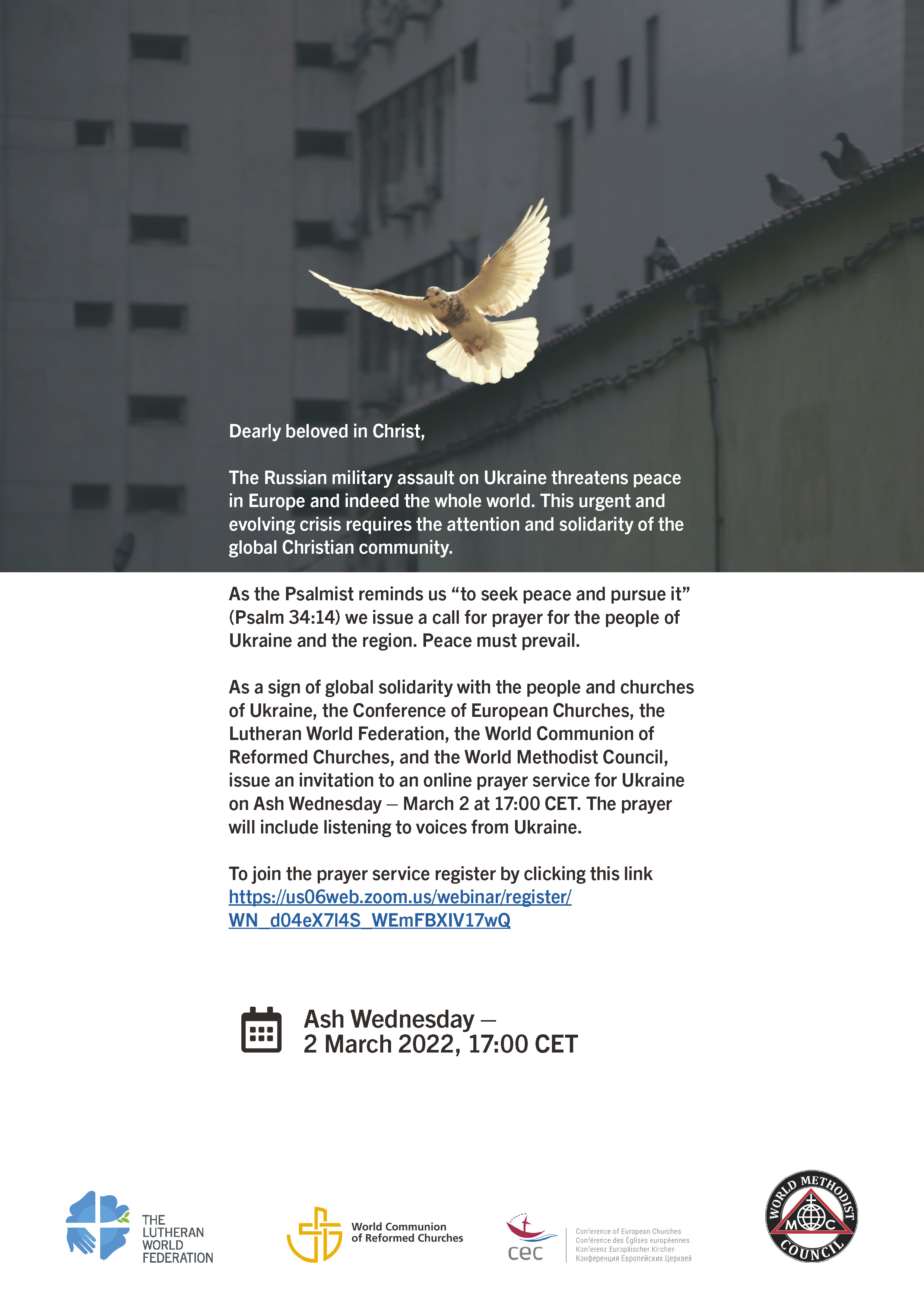 |    *https://www.nato.int/cps/en/natohq/opinions_192408.htmPress briefing by NATO Secretary General Jens Stoltenberg followingan extraordinary meeting of the North Atlantic Council 2022年2月28日 和平公義日--228紀念75周年 台灣基督長老教會為烏克蘭祈禱 16 處處有正義,有公道。 17 因為人人行為正直;他們將永遠安居樂業。 18 上帝子民的家穩妥安全,無憂無慮。 以賽亞書 第32章: 16-18(現中2019版經文) 台灣基督長老教會(PCT)的成員身為基督的肢體與普世團契的一份子,關切烏克蘭並為她代禱。 在過去的幾天裡,歐洲發生令人難以置信的事件,我們憂心烏克蘭人民與政府並為其禱告。由俄羅斯總統普廷領導下,攻擊一個有主權的民主國家,試圖推翻其政府,徹底違反國際法、聯合國憲章與基本人權。 我們關切烏克蘭人民的安危;我們為遭俄羅斯軍隊殺害及受傷的受害者與家屬祈禱。我們感謝那些伸出援手的國家,為因武裝衝突而流離失所的烏克蘭人民,提供住所與人道救助。 我們也為俄羅斯祈禱,根據經驗我們清楚知道,專制政府與獨裁者並不代表其人民的心願,正如最近我們所見證的一般。我們為俄羅斯人民祈禱,他們不顧自身,承擔巨大風險,勇敢走上街頭,大聲疾呼反對這場戰爭。 台灣基督長老教會是積極的普世成員,與普世改革宗教會聯盟(WCRC)及普世教會協會(WCC)一同支持烏克蘭教會與人民尋求公義與和平。以賽亞書32:16-18 此外,我們與世界各地的基督徒姐妹兄弟一起,敦促歐洲及其他國家政府與盟友,包括蔡英文總統及台灣政府,盡其所能尋求外交管道,確保可信、可持續的和平進程發揮成效。正如北大西洋公約組織(NATO)秘書長Jens Stoltenberg近日於記者會上(2022年2月24日)所言:「民主永遠戰勝專制。自由永遠戰勝壓制。」* 台灣基督長老教會呼籲結束戰爭、放下武器並從烏克蘭撤出所有俄羅斯軍隊。主啊,願祢的國降臨, | 上主,求祢憐憫 為烏克蘭人民祈禱 基督,求祢憐憫 為俄羅斯人民祈禱 上主,求祢憐憫 為歐洲人民祈禱 上主,求祢憐憫 為烏克蘭戰爭中無辜受害者祈禱 為因衝突而流離失所的人祈禱 基督,求祢憐憫 祈求戰火停息及所有俄羅斯軍隊從烏克蘭撤軍 祈求在外交和平談判中能有明智的判斷力 上主,求祢憐憫 祈求公義 祈求和平 祈求醫治 祈求重建 光明、希望與愛的主,在祢的憐憫中, 垂聽我們。 阿們 | | 徐信得牧師 PCT第66屆總會議長 | 陳信良牧師 PCT總幹事 | *北大西洋公約組織(NATO)秘書長Jens Stoltenberg記者會https://www.nato.int/cps/en/natohq/opinions_192408.htm |
