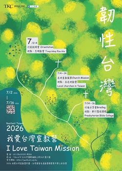 2026我愛台灣宣教營 ILT【韌性台灣】 2026年「我愛台灣宣教營 ILT」,歡迎來這韌性之島,生命之島,上帝帶領的恩典國家。 讓我們一起在台灣各地教會學習、服事與訪問,領受與經歷上帝豐盛的愛和恩典。期盼國內外青年在「我愛台灣宣教營 ILT」的參與與服事,體驗台灣之美,更加認識和疼惜台灣,開闊普世視野,彼此鼓勵和成長。