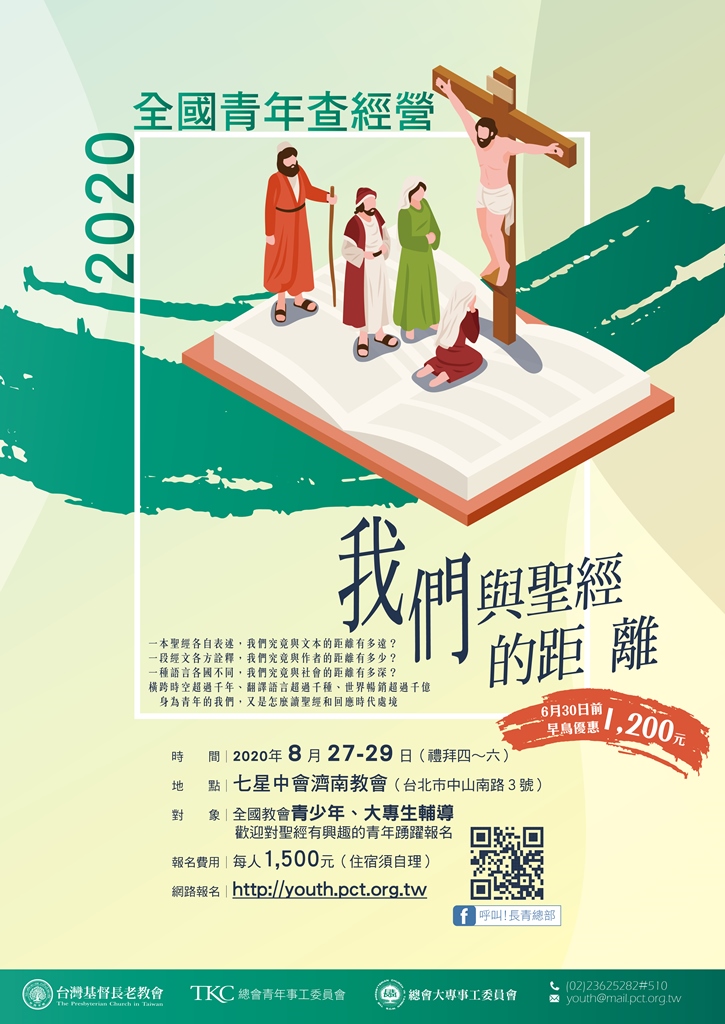 2020年全國青年查經營[我們與聖經的距離] 一本聖經各自表述,我們究竟與文本的距離有多遠?一段經文各方詮釋,我們究竟與作者的距離有多少?一種語言各國不同,我們究竟與社會的距離有多深?橫跨時空超過千年、翻譯語言超過千種、世界暢銷超過千億,身為青年的我們,又是怎麼讀聖經和回應時代處境